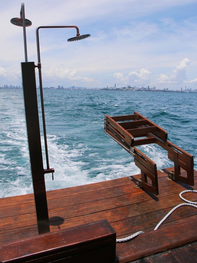 ช็อตเด็ดเลยชอบความฝักบัวล้างตัวด้านนอกเรือที่โคตรคลู ไม่ได้ใช้อาบน้ำหรอกตรงนี้ ใช้ถ่ายรูปกันเป็นหลักมากกว่า ฮ่าฮ่าฮ่า ตลอดการเดินเรือจะมีผู้ดูแลบนเรืออย่างดี ดูเเลเเก๊งค์ของเราตลอดเส้นทาง