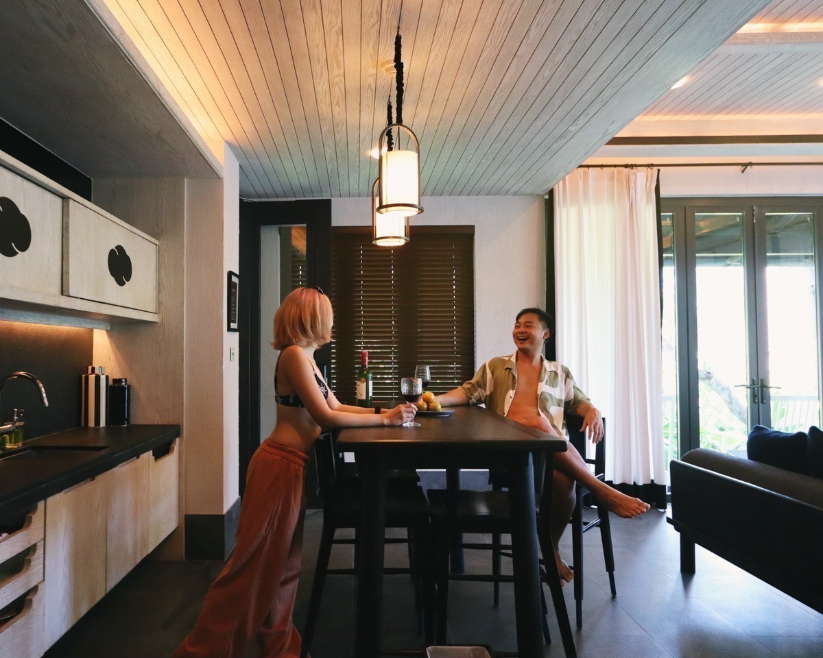 ก็คือช้นล่างมัน Work จริงคุณ มันเหมาะสำหรับคนกิจกรรมอย่างเราเลย แยกโซนได้ดี พื้นที่ใช้สอยเยอะ อยากสูบบุหรีก็ออกข้างนอก หันหน้าเข้าป่าเข้าทะเล อยากออกไป Pool Party ก็ผลักกระจบบานใหญ่ออกไป สำคัญคือชั้นล่างมีโซน Kitchen เบา ๆ โต๊ะยาวให้ได้แชร์อาหารเวลาเพื่อนมาอีกด้วย เริศ